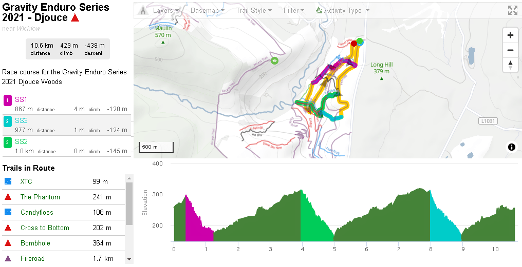 El formato de la carrera fue similar al adoptado últimamente aquí en Irlanda desde el año pasado. Para evitar que todos los corredores se presenten tanto sábado como domingo, entrenos y carrera como es habitual. Lo que hacen es que ciertas categorías corren el sábado y otras el domingo. Y lo que hacen es que tienen unas 4h para completar el recorrido, hacer los tramos cronometrados tantas veces como quieran y se cronometra la bajada más rápida de cada tramo. Claro que el recorrido lo permite pues como ves aquí abajo es un recorrido corto. En este caso fueron unos 10km con 430m de subida y lo mismo de bajada y 3 tramos. El TC2 y TC3 de casi 1km y -124m y -145m de bajada respectivamente. El TC1 solo 870m y 120m de bajada. Con un recorrido de este tipo si físicamente estás bien puedes hacer 2 vueltas completas sin problemas alguno e incluso 3 como fue el caso de los corredores élite.