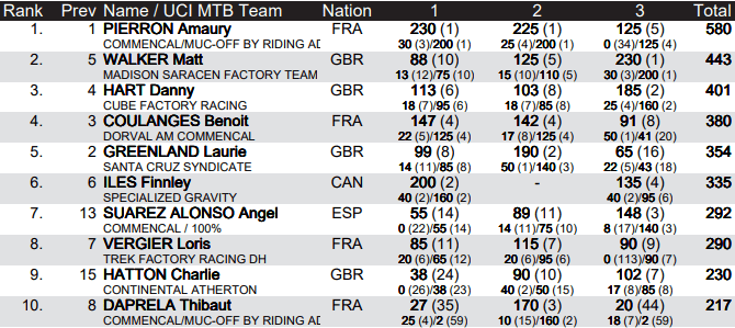 Siguieron bajando corredores y los tiempos iban mejorando. Amaury Pierron, que también salió bastante temprano hizo un bajadón y estuvo unos minutos sentado en el hotseat. Hasta que llegó el español Angel Suarez que hizo una bajada digna de haber ganado, sacándole 0.160 a Amaury. Siguieron bajando corredores y nadie mejoraba el tiempo de Angel, ¿sería esta su primera carrera ganada de la Cdel Mundo? Eso parecía, hasta que llegaron los corredores del top5 y los británicos Danny Hart y Matt Walker hicieron cada uno una bajada increíble metiéndose por delante de Angel. Fue Matt Walker el que se llevó el pato al agua, ganando además su primera carrera de la Copa del Mundo, ya que en el 2020 fue ganador de la general sin ganar ninguna carrera, que se decidió en Lousa con una bajada épica.