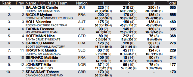 En el caso de las chicas, que empezaban antes, pillaron aún la zona del bosque bastante embarrada y con barro que se pegaba por todo y hacía ir mucho más lento, pero más rápido que en la clasificación seguro. Según fueron bajando cada una fue mejorando el tiempo de la siguiente. A las primeras en bajar solo con mantenerse sobre la bici ya les aseguraba un buen tiempo ya que casi todas iban teniendo caídas. Según fueron bajando las más rápidas, ya iba primando no solo no caer, también ya hacer buenas líneas y mantenerlas. Nicole Myriam al inicio tuvo una caída que le restó mucho tiempo pero luego recuperó y logro subir al “hot seat”. Vali Holl bajada volando, pero tuvo 2 caídas fuertes que le hizo perder al final mucho tiempo. La francesa Marine Cabirou tuvo una caída fortísima en la primera zona de tocones en la parte alta del recorrido, intento continuar pero tuvo que abandonar, esperemos esté bien.