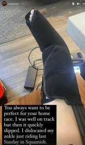 De momento no he visto ninguna noticia ni publicación de nadie lesionado durante los entrenos, esperemos que continúe así. A diferencia de la carrera de DH en Moint-Sant-Anne donde Camille Balanche se rompió la clavícula, Loic Bruni se dislocó el hombro, y Loris Vergier tuvo una caída fuerte y no tomará la salida. En la EWS solo he visto que ALN, la rider local del Rocky Mountain, hace una semana se dislocó un tobillo y está haciendo lo posible para poder recuperar lo posible y correr.