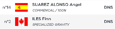 Pero algo aún más interesante ha pasado en esta clasificación masculina élite. Si miras la tabla de puntos de la general tras Mointe Sainte-Anne, Amaury Pierron marcha primero y el único que podía discturile el podio final era Finn Iles que está 249 detrás. Ganar la carrera son 250pts, por lo que si Amaury no puntuara y Finn ganara, podría ganar la general. Pero Fin Iles tuvo una caída fuerte en el campeonato del mundo en Les Gets este finde y no participó en la carrera, iba con el cuello lleno de tiras de estas de fisioterapia para sujetarlo. Y en la clasificación hoy aparece como DNS, es decir que no ha tomado la salida y por tanto no podrá participar en la carrera. Igualmente ha sido con Angel Suarez. En ambos casos muy seguramente ha sido por sus caídas el finde pasado y no han tomado la salida para no arriesgar y ya pensando en la temporada siguiente.