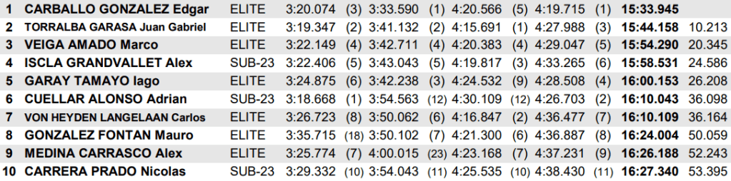 Adrian Cuellar defendió su título de campeón Sub23 ya que aunque Alex Iscla fue el ganador de la categoría no podía ser Campeón de España (que me corrijan los que saben, puede ser porque vive en Andorra?).