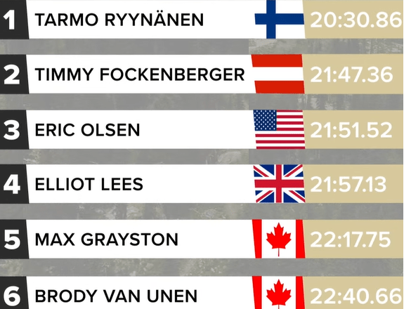 En el segundo reto la carrera de enduro tenía 5 tramos repartidos en 25km con 500m de subida, todos ellos al inicio en el enlace al primer tramo y nada más y nada menos que 2mil metros de bajada usando remontes. En los hombres el finlandés, que tiene ya buena experiencia en competición ganó por más de 1min de margen, ganando además cada tramo. El canadiense Brody Van Unen tuvo una caída muy fuerte en el primer día de entrenos y bienvenida que le dejó muy tocado, pero aún así logró quedar 2do en uno de los tramos.