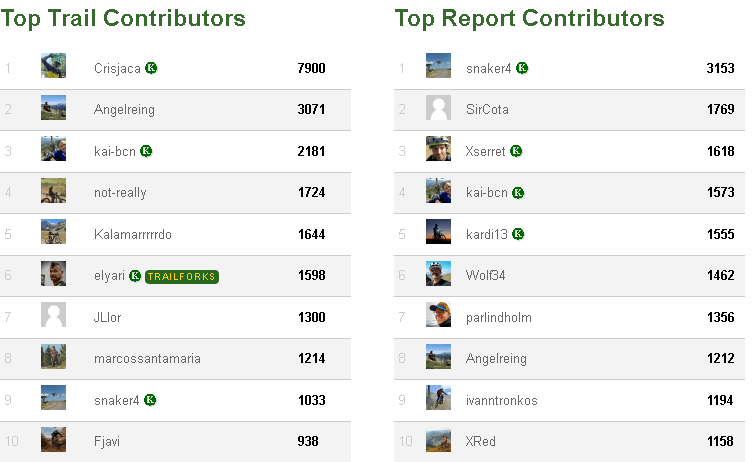 Todo esto ha sido gracias al gran trabajo de los administradores locales y usuarios que han colaborado añadiendo y corrigiendo contenido en la plataforma. Si eres un usuario activo en España seguro te sonarán algunos de sus perfiles e incluso te hayan contactado cuando comenzabas a usar la aplicación para orientarte sobre como hacerlo de la mejor manera. Gracias Crisjaca, Angelreing, kai-bcn, Kalamarrrrdo, JLor, marcossantamaria y el resto por la gran labor que han hecho. Varios de ellos están de hecho en el top20 de colaboradores a nivel mundial….me pregunto si de día realmente trabajan o solo están en Trailforks…jajajaja!!