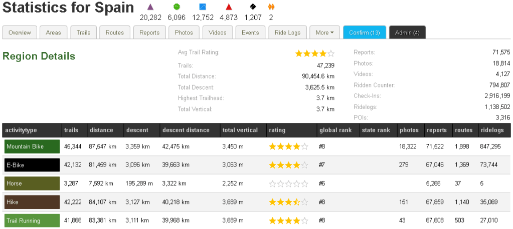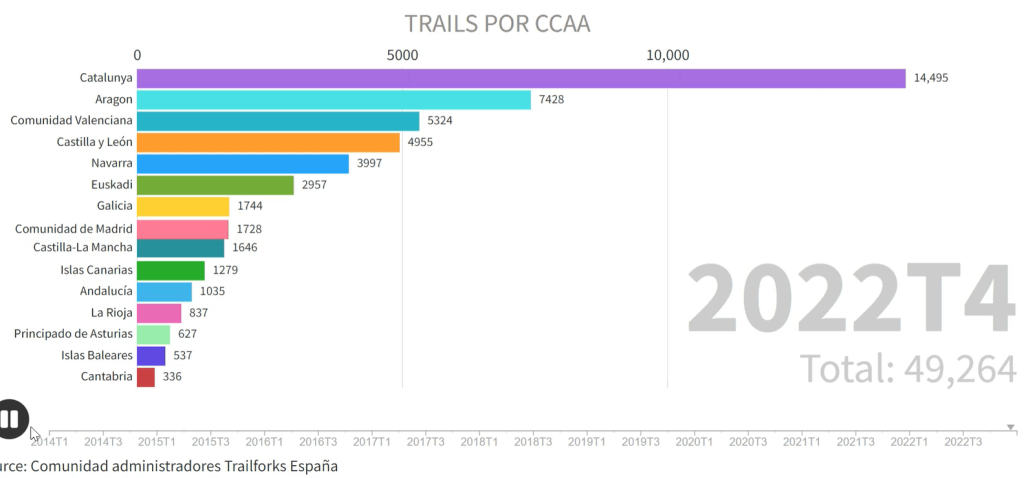 En lo que respecta a estadísticas de contenido en España aquí te dejo un video muy chulo montado por el adminstrador JLor en el que se ve la evolución de la cantidad de caminos por Comunidad Autónoma desde el 2014, año en que apareció Trailforks. Inicialmente Madrid, Baleares y Andalucía estaban arriba pero poco a poco las demás comunidades fueron sumando más usuarios y creciendo en contenido. Cataluña arrancó en el 2018 y durante par de años creció meteóricamente para luego ser la Comunidad Valenciana quién tomara el relevo y finalmente Aragón con la colaboración de varios administradores locales que han subido montón de contenido.