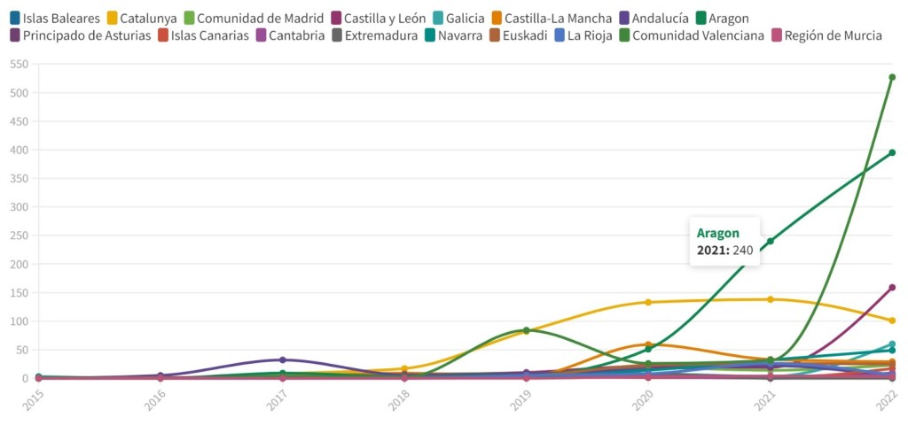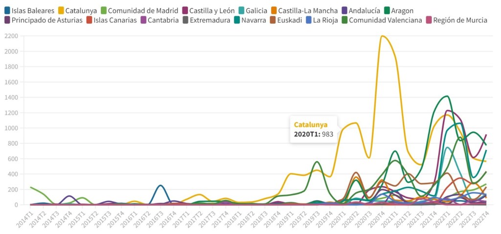 En este gráfico puedes ver como evolucionó durante estos años la cantidad de contenido añadida en cada Comunidad Autónoma en cada trimestre. El nefasto año 2020 de la pandemia dio el pistoletazo de salida para que en muchas otras regiones más y más usuarios comenzaran a subir contenido. Imagino que tanta gente en casa encerrada y luego sin poder ir muy lejos, explorando sus alrededores, se dieron cuenta del potencial de esta herramienta.