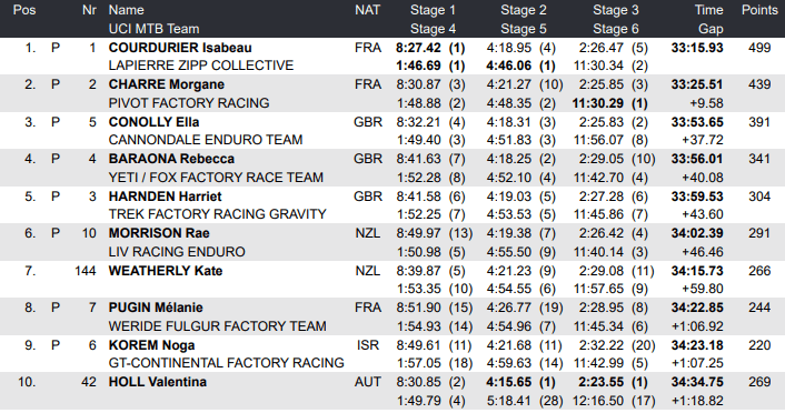 La chilena Florencia Espiñeira (Orbea), campeona el año pasado en ebikes, estará haciendo también varias carreras en bici normal. En esta carrera ha quedado en la 13ma posición con el mejor puesto en el TC2 que quedó 8. La canadiense Andreane Lanthier Nadeau ALN (Rocky Mountain) no ha empezado tampoco como quisiera la temporada quedando en la posición 15 sin lograr entrar en el top10 en ningún tramo. La británica Katy Winton (GT), una de las veteranas del circuito, que el año pasado se lo tomó sabático tras un inicio no muy satisfactorio, quedó en la posición 18 con un 9no en el TC4. La también británica Becky Cook (Orange) quedó bastante atrás, en la posición 24 con todos sus tiempos fuera del top20, a ver va mejorando según avanza la temporada. Otra veterana, que antes estaba siempre en el top10, la canandiense Miranda Miller, quedó en el 31, penalizada con 1min por llegar tarde al TC4, se nota el estar tanto tiempo fuera de ritmo de carrera. La atleta trans neozelandesa Kate Weatherly quedó 7ma posición con el TC1 su mejor tramo en 5ta posición.