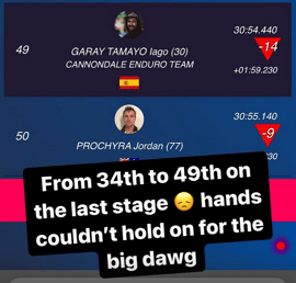 El español Iago Garay (Cannondale) quedó en la pocisión 49, perdiendo en el último largo tramo mucho tiempo que le hizo bajar nada más y nada menos que 14 posiciones. Iago tuvo un percance solo un par de días antes de la carrera y tuvo que correr con el dedo anular vendado y fijo ya que tuvo una pequeña rutora de uno de los huesos. Esto obviamente le pasó factura en el último largo tramo quedando el 67. Su mejor tramo fue el TC1 que quedó el 32. El canario Edgar Carballo (Orbea) quedó el 73 a 3:13.82 de la cabeza de carrera, su mejor tramo fue justamente el último con la pos 72 y el peor TC4 en el 83.