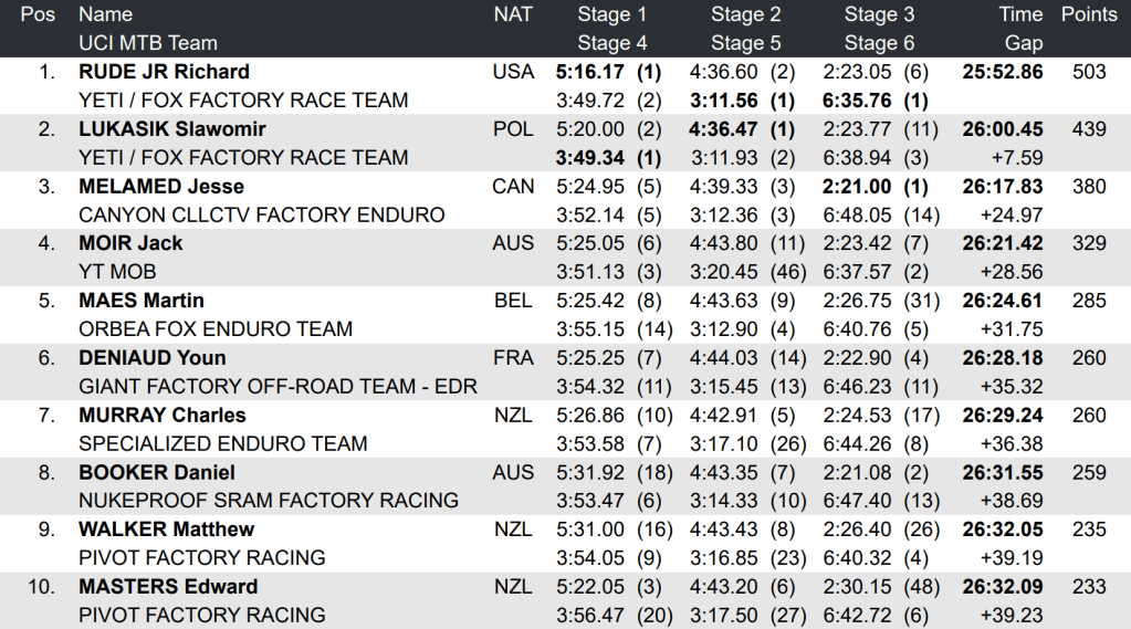 De esta manera, Richie ganó el día, con Lukasik a 7.59s y Jesse Melamed ya a 24.97s. El australiano Jack Moir (YT) también logró colarse bien arriba aunque tuvo un mal 5to tramo quedando el 46 que quizás le hizo perder ese tercer puesto ante Jesse, al final quedó a 4s de Jesse y 28.56 del primero. Cerró el top5 el belga Martin Maes (Orbea) a 31.75s que no ganó ningún tramo pero fue bastante constante. Curioso que también tuvo un mal TC3 quedando el 31 en ese tramo.