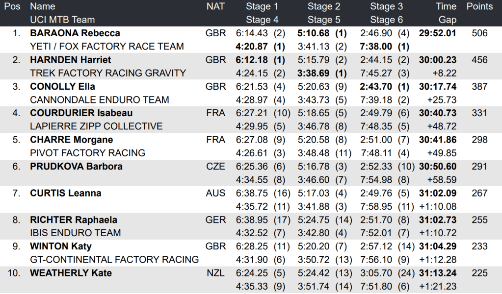 Las británicas Bex Baraona y Herriet Harnden pasaron todo el día turnándose en el liderato de la carrera, fue una pelea completamente a dúo. Ella Connolly (Cannondaly) logró arrebatarles TC3, el único que ellas no ganaron. Rebecca “Bex” Baraona (Yeti) tuvo muy buen día y logró ganar 3 tramos, lo que además le suma de cara a la general con las nuevas reglas que suman puntos para el top10 de cada tramo. La también británica Harriet Harnden (Trek) le plantó cara ganando 2 tramos y quedando el top3 en todos los tramos, pero no fue suficiente y quedó segunda 8.22s tras más de media hora de competición. Ella Connolly ceró un buen día con el tercer lugar pero ya a 25.73s de Bex Baraona. Isabeau Courduier salvó unos puntos vitales a 48.72 y cerró el top5 la también francesa Morgane Charre (Pivot) a 49.85s.