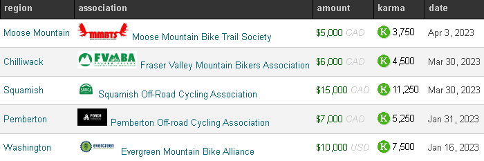 En el caso particular de OneUp Components aquí tienes lo que han donado en lo que va de año 2023 y dónde lo han donado. Como ves, son todas asociaciones relacionadas de una u otra manera con nuestro deporte y en el que gran parte de su trabajo es el de mantener y cuidar los senderos que tienen bajo su tutela.