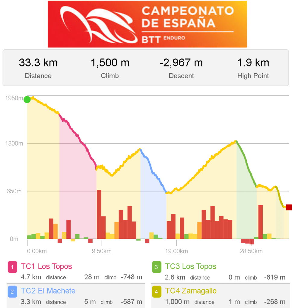 Los participantes se enfrentaron a 4 tramos cronometrados repartidos en 33km y 1500m de subida. Verás en el perfil que tuvieron casi 3000m de bajada, algo inédito en otras carreras de enduro nacionales, sobre todo mirando que “solo” subieron 1500m. Pues resulta que la organización hizo unos remontes iniciales para dejar a los corredores a casi 2000m de altura, desde allí tuvieron un enlace de bajada hasta el inicio del primer tramo cronometrado. Como puedes los números fueron apabullantes. El TC4 que fue el más corto, bajaron 268m en solo 1km. El tramo más largo fue justamente el TC1 con 4.7km y nada más y nada menos que 748m de bajada. Pero es que el TC2 y el TC3 no se quedan atrás, con 587m y 619m de bajada respectivamente y 3.3km y 2.6km cada uno de longitud, una locura. El terreno seco y suelto como se puede ver en todas las historias que han ido subiendo los participantes y espectadores.