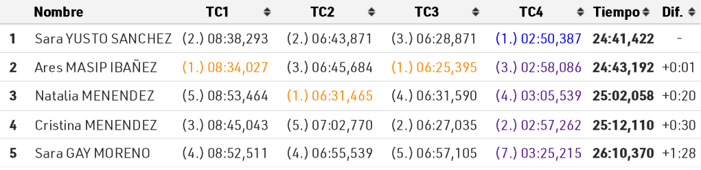 En el apartado femenino la corredora Sara Yusto venía con muchas ganas de revalidar su título de campeona élite, por nada más y nada menos que 4ta vez. Pero Ares Massip, Natalia Mendez y demás participantes intentarían no ponerselo fácil y así fue. Ares Massip, fresca de ganar la semana pasada el Enduro Salines venía con muchas ganas y de hecho ganó 2 tramos, el TC1 y el TC3 y llegaron al último tramo con Ares liderando por 6s, la carrera parecía asegurada. Pero un fallo en este tramo permitió a Sara recuperar esos preciosos segundos y ganar con una diferencia ínfima de solo poco más de 1s y de paso ganar ese último tramo. La Junior Natalia Menendez logró agenciarse el TC2 pero no logró hacer valer el tiempo ganado en ese tramo ya que quedó 5ta en el TC1 y 4ta en los 2 restantes tramos. La Sub23 Cristina Menendez logró hace 2 segundos puestos en el TC3 y TC4 pero en el TC2 perdió muchísimo tiempo lo que le apeo de la pelea por el top3. Cerró el top5 féminas Sara Gay, otra habitual de los podios nacionales de enduro.