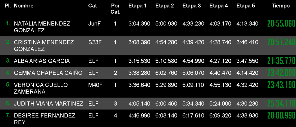 En féminas la junior Natalia Menendez, reciente campeona de España junior, batalló codo con codo con su hermana Cristina Menendez, también campeona de España de su categoría sub23. Natalia ganó 3 tramos y Cristina logró arrebatarle el TC2 y el TC5, para acabar ganando Natalia con un tiempo total de 20:55.060, Cristina a poco más de 2s con 20:57.240 y tercera Alba Arias Garcia, primera élite, con 21:35.770. Cerraron el top 5 Gemma Chapela con 23:42 y Verónica Cuello primera M40 con 23:43.190. No he podido encontrar fotos del podio femenino