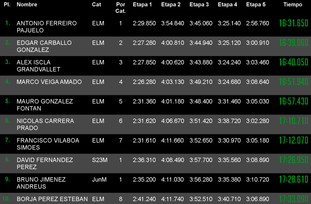 En los hombres la pelea fue encarnizada entre Toni Ferreiro, Edgar Cabrallo y Alex Iscla, que al final fueron quienes se repartieron el podio de la general y élite. Marco Veiga arrancó la carrera ganando el TC1 con 1s de ventaja sobre Edgar Carballo y Toni quedando 4to en este tramo. En el TC2 Toni se recuperó y ganó mucho terreno, ganando por poco más de 6s y poniéndose líder de la carrera, posición que ya no abandonó hasta el final aunque solo logró ganar el tramo nocturno, último tramo de la carrera.