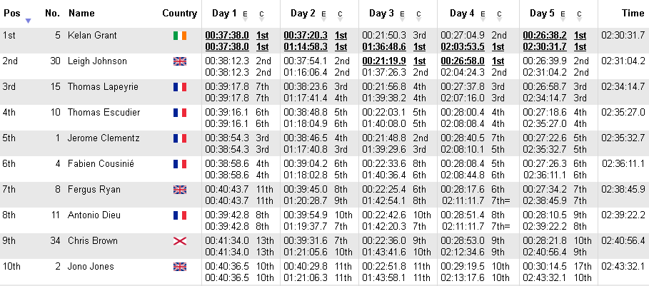 En M40 el irlandés Glyn O’Brien, pionero del RedBull Rampage y leyenda en su país, comenzó ganando los primeros días y comenzó el 4to día como líder de la general. Pero varios fallos y problemas mecánicos le dejaron finalmente en el tercer puesto. Fue el finés Leo Kokkonen de Pole quién se llevó la victoria seguido del británico Christian Ferrone con Glyn O’Brien pisándole los talones. En M50 el irlandés Joe Ward dominó con mano de hierro, solo cediendo un tramo de los 30 en disputa y ganando con una ventaja de 7min sobre el segundo puesto.