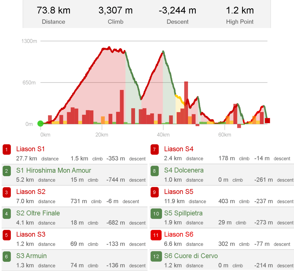 Tendrán 6 tramos cronometrados siendo los 2 primeros tramos lo más largos y con más desnivel, 5.2km y -744m en el TC1 Hiroshima Mon Amour y 4.1km con -682m de bajada en el TC2 Oltre Finale. Si además le sumas la posibilidad de lluvias, la cosa se puede poner bastante peliaguda. El resto de los tramos todos tienen menos de 2km pero con desniveles de hasta -240m por lo que hay una verticalidad importante que combinada con lo técnico de las bajadas puede ponerle las cosas complicadas a muchos.