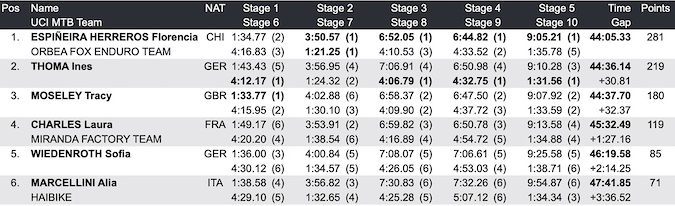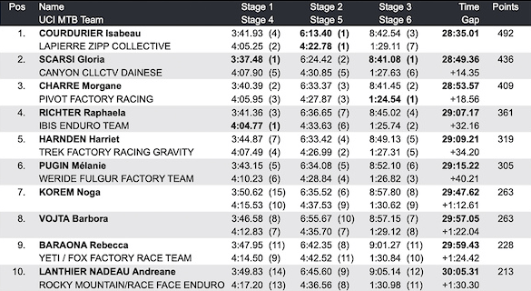 Noga Korem, que ya no está con GT y corre con una Commencal, tuvo un mal inicio de día quedando el 15 en el TC1 pero fue recuperando poco a poco para quedar en el 7mo puesto. Bex Barona en 9no puesto no tuvo su mejor día y ALN sigue recuperando el estado de forma que tenía hace par de años y se cuela en el top10.