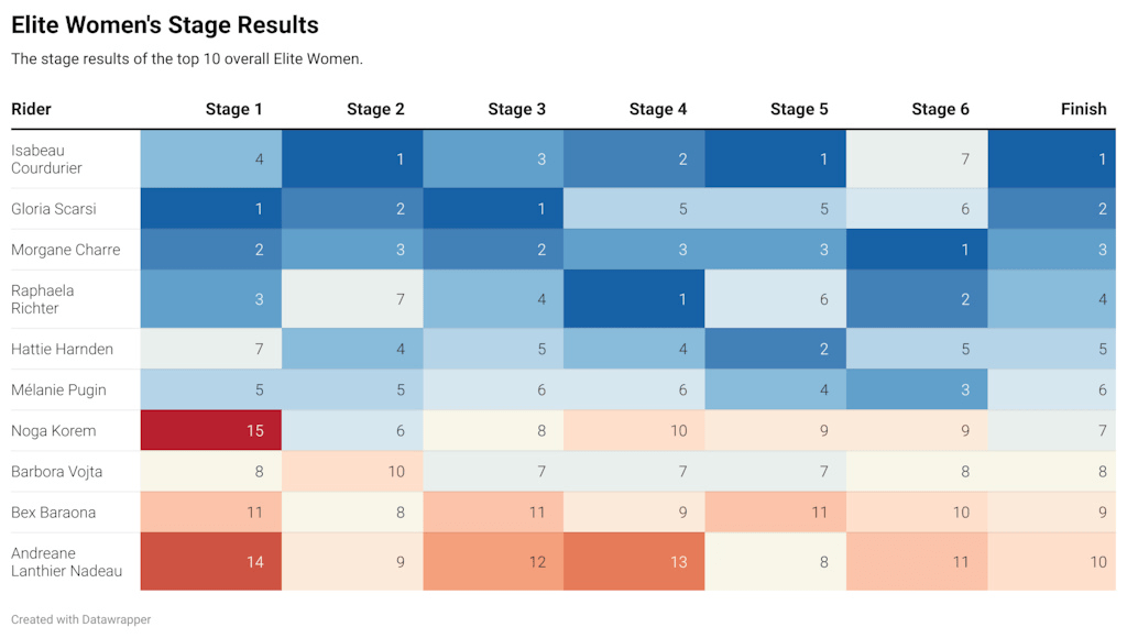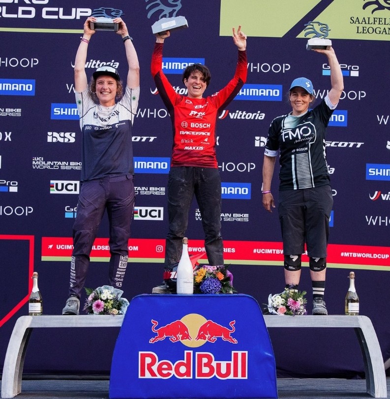 En las féminas Isabeau Courdurier indudablemente es la rival a batir, lo tendrán complicado sus rivales para evitar que revalide su tercer título consecutivo e iguale a Cecile Ravanel y Tracey Moseley que lo hicieron antes que ella. En Leogang ganó 3 tramos de los 6 en discusión pero sobre todo importante fue el ganar el TC2 en el que logró sacar una ventaja importante de 11s que luego supo administrar muy bien e incluso ampliar un poco más para ganar con 14.35s de ventaja sobre la italiana Gloria Scarsi que quedó 2da ganando 2 tramos. En tercero la francesa Morgane Charre ganó un tramo más quedando a 18.56s de Isabeau. En cuarto la alemana Raphaela Richter ganó otro tramo más pero ya quedó bastante alejada del primero con 34.20s de diferencia.