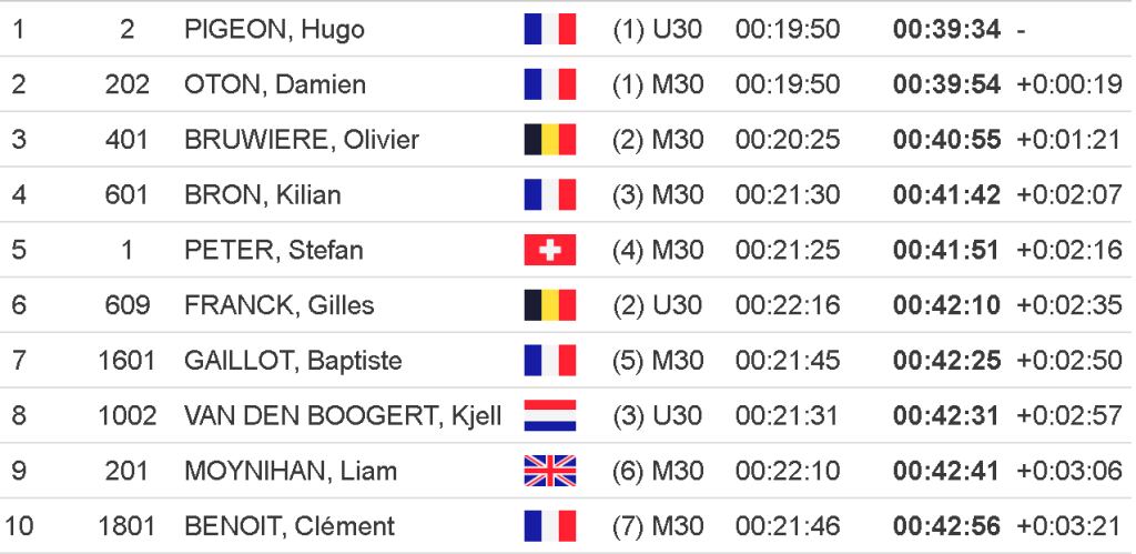 Así quedó el top10 de la general de los Pros masculinos que corrieron esta mañana. Como suele ser habitual, muchos franceses entre los primeros, es una carrera fetiche para muchos de ellos. Hugo Pigeon y Damien Oton estuvieron batallando y acabó ganando Hugo por solo 19s. Tercero entró un alemán y cuarto el conocido Killian Bron que tantas carreras de este tipo tiene en su haber, con varios primeros puestos en la Mega y en la Mountain of Hell.