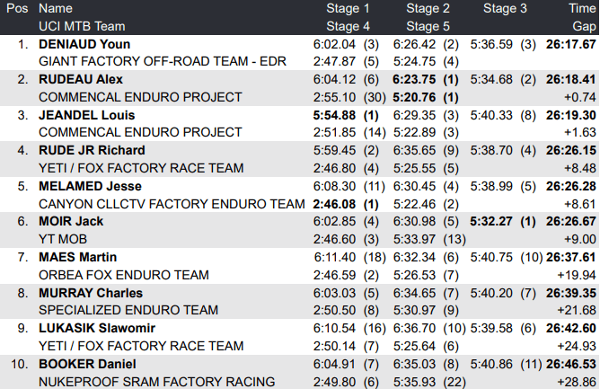 Por otra parte Alex Rudeau (Commencal) parecía que también lucharía por el podio ganando 2 tramos cronometrados pero en el TC4 perdió montón de tiempo y Youn Deniaud (Giant) sin ganar ningún tramo, logró ser muy regular y acabó ganando por escasos 0.74s adelantando en el proceso a Alex y a Jack Moir. Tercero fue el joven Louis Jeandel (Commencal) que ganó el TC1 y entró a escaso 1.63s del primer puesto. Richie Rude (Yeti) se coló en el 4to puesto sin ganar ningún tramo. Los también habituales del podio Jesse Melamed (Canyon) y Jack Moir (YT) ganaron un tramo cada uno quedando 5 y 6to respectivamente.