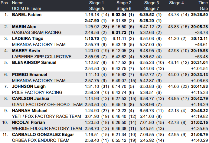 En el masculino una vez más Fabien Barel (Canyon) se lleva el gato al agua ganando además 4 tramos y con una cómoda ventaja de 38.78s sobre el segundo lugar, el español Alex Marin (GasGas) que logró ganar un tramo. Tercero el portugués Tiago Ladeira (Miranda) que también ganó un tramo. Cerraron el top5 Marry Kevin (Lapierre) y un habitual de las carreras de DH pero no enduro, Samuel Blenkisop (estará probando para cambiarse de modalidad y solo para probarse a sí mismo y divertirse un poco). Edgar Carballo no tuvo su mejor día y quedó fuera del top10 en la 11va posición.