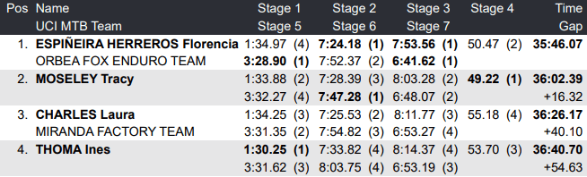 A falta de una carrera para acabar la temporada, en 2 semanas en Les Gets, la general marcha de esta manera. Tras Loudenvielle en las féminas élite ha habido bastante movimiento a partir de la 3ra posición con varias corredoras ganando o perdiendo posiciones. Ella Connolly entra en el top10, Bex Baraona baja a la 5ta posición y Harriet Harnden y la italiana Gloria Scarsi suben a la 3ra y 4ta. En el masculino élite Alex Rudeau y Youn Deniaud fueron los más beneficiados por supuesto. Alex sube al 2do puesto y Youn salta del 9no al 6to puesto. Matt Walker que ganó en Val di Fassa esta vez quedó fuera del top 10 y baja hasta el 9no puesto. Jack Moir logra meterse en el top10.