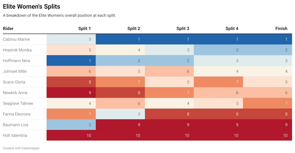 Fue la francesa Marine Cabirou, que también lleva un año muy bueno con varios podios, quién se llevó la mejor parte, ganando con autoridad además, siendo la mejor en 3 de las secciones y ganando con 3.979s sobre Monika Hrastnik que fue de menos a más pero que no fue la más rápida en ninguna de las secciones. Solo Nina Hoffman, que quedó 3ra, logró hacer el mejor tiempo en el primer split de la bajada. Cerraron el top5 Mille Johnset y la italiana Gloria Scarsi.