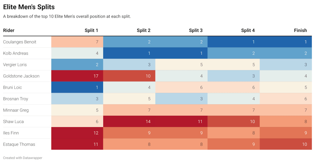 A notar Greg Minnaar en 7mo puesto, no deja de sorprender con su gran consistencia y quedando en el top10 de manera muy constante superando a corredores con la mitad de su edad. Impresionante como Jackson Goldstone logra rebajar tanto tiempo, en el primer split estaba el 17 y acabó el 4to, recuperando montón de tiempo.