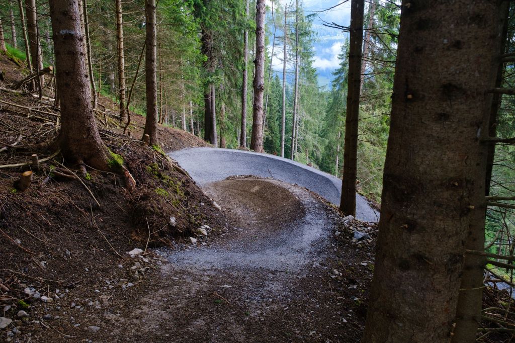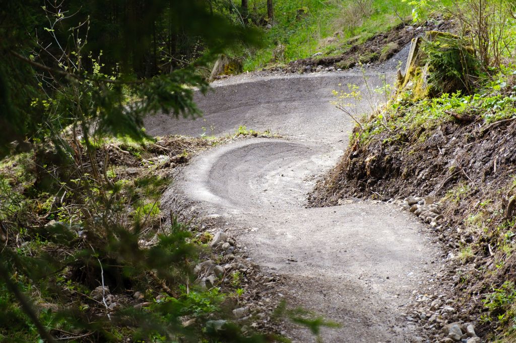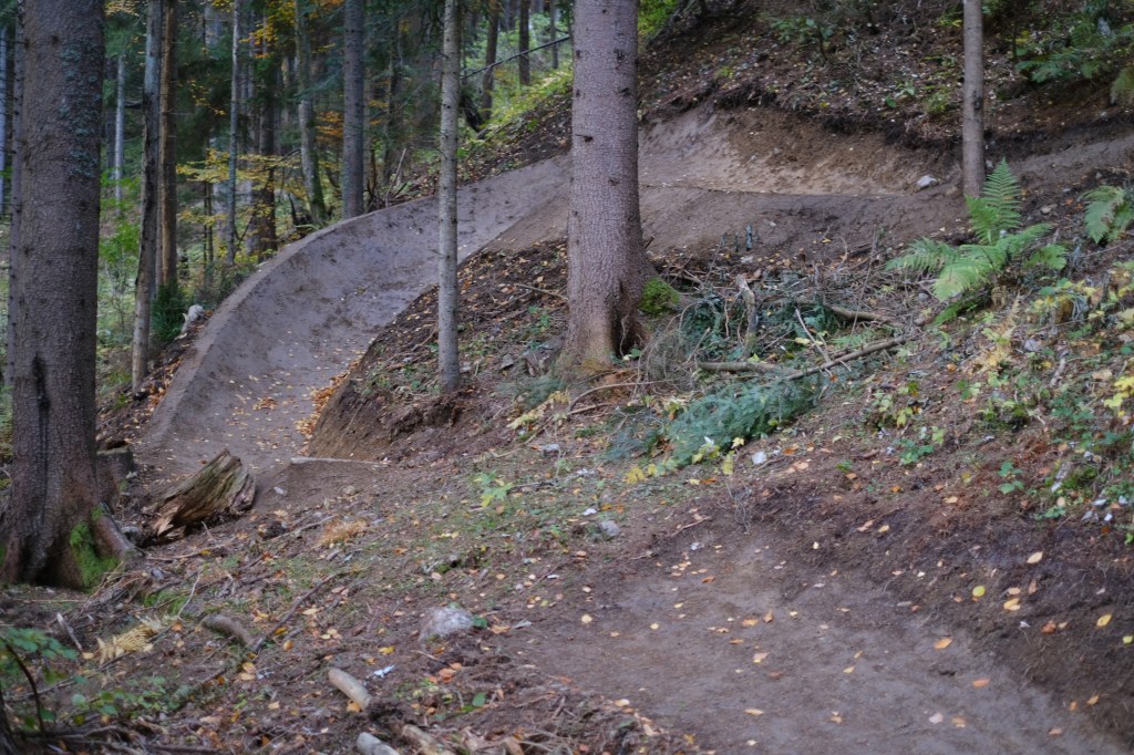 Willard: Al igual que para montar en bici, para construir, me gusta una mezcla de tramos naturales y construidos a máquina en el mismo sendero. Pero lo más importante es el terreno tal y como es antes de poner la pala en la tierra. Lo ideal sería contar con una variedad de elementos naturales, como grandes rocas, montículos de tierra, una topografía única, miradores, cerca de una fuente de agua, etcétera. Luego, la selección del corredor y la señalización del sendero es lo que da una primera idea de la historia que contará el sendero. Es importante que esta historia sea coherente y predecible para los ciclistas: por ejemplo, un sendero azul no debería llevarte de repente a un “rockgarden”. En mi caso, sueño con tramos naturales empinados seguidos de peraltes de buen tamaño, que se conviertan en un terreno ideal de hojarasca orgánica con gran agarre y que desemboquen en saltos empinados con grandes recepciones. Por supuesto, la sección orgánica, no mineral, no duraría mucho, pero eso es parte de la alegría de soñar despierto. Por lo menos, la parte sin pendiente debería drenar bien. Un sendero en el que colaboré y que ha envejecido como un buen vino es el Blackgartner Trail, en Austria. Se parece un poco a éste, pero aún le faltan más saltos.