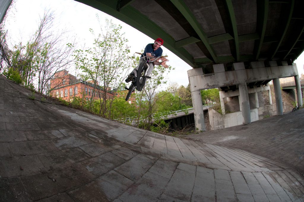 Willard: En realidad quería comprarme una bicicleta de descenso cuando era un niño optimista de 12 años, pero eran demasiado caras, incluso a principios de la década de 2000. Mis padres se cansaron de comprarme bicicletas Walmart cada una o dos semanas para que las rompiera, así que me decidí por una BMX Nirve Foil de 200 dólares. Ese primer verano, me caí sobre el manillar probando un salto que un amigo y yo construimos con un montón de grava suelta. Construcción de grado A, jaja. Me desgarré 25 centímetros de la pared del estómago, me revolví bastante los órganos internos y me rompí una arteria. Después del accidente, comí algo de comida basura y me senté dentro de casa. Empecé a desmayarme cuando mi padre llegó a recogerme, como estaba previsto, y enseguida se dio cuenta de que había que llevarme al hospital. Durante el trayecto perdí y recuperé la conciencia varias veces, pero recuerdo que el médico se sintió decepcionado por mi decisión de quedarme dentro y comer Zebra Cakes. Estuve a punto de morir desangrado. Mientras me recuperaba en el hospital, alguien me trajo Props Megatour 1 en VHS, un vídeo de BMX con Sergio Layos, Gary Young, Chris Doyle y muchos más. Me enganché.
