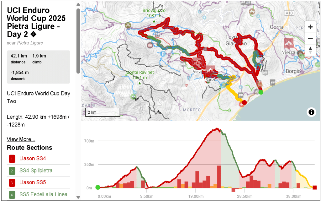 El domingo tuvimos el segundía de carrera en Pietra. El día anterior sábado acabó con Harriet Harnden a lomos de su Nicolai G1 con correa y transmisión Pinion de líder fémina élite y a Jack Moir a lomos de su YT líder en el apartado masculino élite. El domingo les esperaba un segundo día casi tan largo como el anterior, con poco más de 42km y 1900m de desnivel, recuerda, sin remontes ni asistencia técnica, por lo que cada corredor debía de cargar con todo a cuestas. El tramo más largo del día sería el 2do, el quinto de carrera, con 3.51km y casi 700m de bajada. Cerrarían el día con 2 pequeños tramos de poco menos de 1km y ciento y poco metros de bajada.