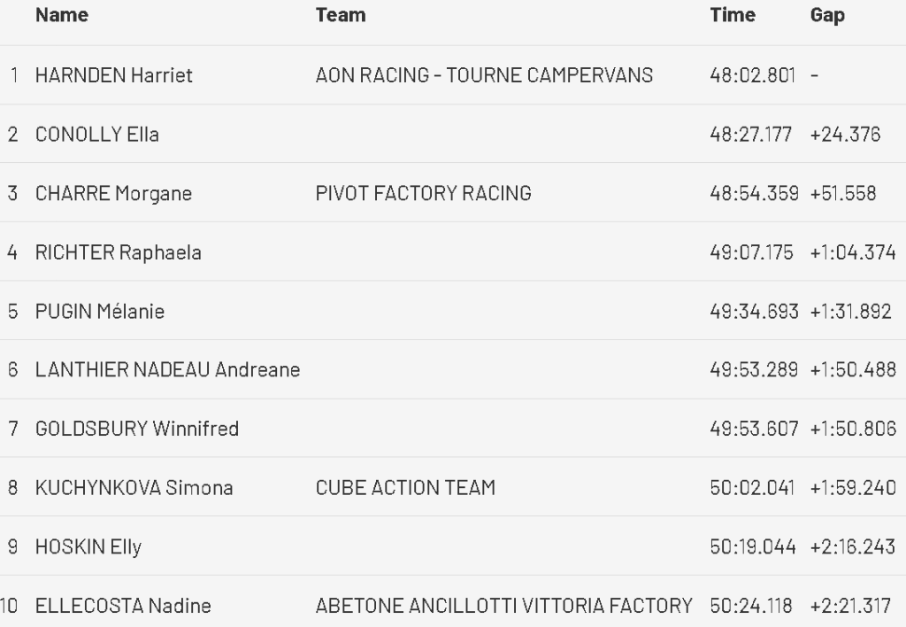 Su compañera británica Ella Conolly mantuvo el 2do puesto logrado el día anterior a 24s de Harriet y la francesa Morgane Charre en el tercero a 51s. Completaron el podio la alemana Raphaela Richter (que corre como independiente con un cuadro diseñado y soldado por su novio) y en quinta posición la francesa Melanie Pugin.