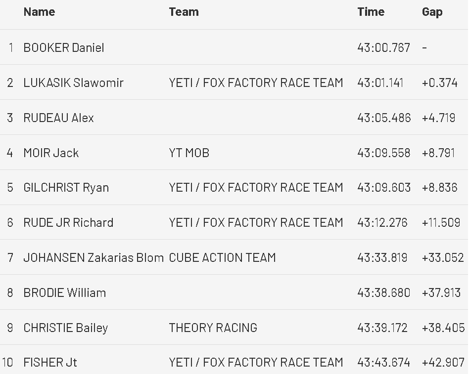 En el masculino élite fue el australiano Daniel Booker el que se llevó la victoria final aunque solo ganó 2 tramos cronometrados durante el finde. Segundo fue el polaco de Yeti Slawomir Lukasik a escasas 0.374 centésimas del primero, alucinante que tras 43min de carrera y casi 20km de tramos cronometrados la diferencia sea tan pequeña. Tercero el campeón del año pasado y campeón del mundo el francés Alex Rudeau a 4s. Jack Moir no pudo recuperarse durante el día del fallo cometido en el TC1 y acabó el día en cuarto de la general. Ryan Gilchrist también del equipo Yeti acabó quinto para el podio élite masculino.