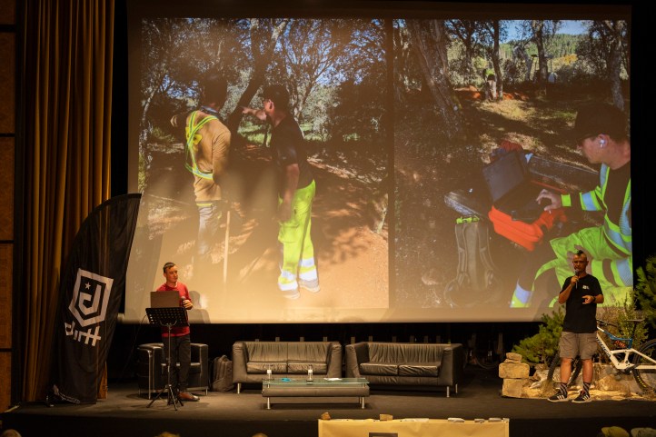 La 3ra de ellas “Implementación de la certificación de trail builders a nivel nacional / regional”, fue una presentación con posterior tiempo para preguntas del público. En ella se trató un tema que está tomando más y más importancia respecto a la necesidad de la certificación y profesionalización del trabajo como trailbuilder, con ejemplos, datos y detalles esclarecedores al respecto. Impartió la conferencia el reconocido trailbuilder y formador Mark Mcclure (original de Reino Unido, basado en Agueda, Portugal) con un servidor como intérprete y ayudando a dar una visión más local o regional de la problemática que abordamos durante la misma.
